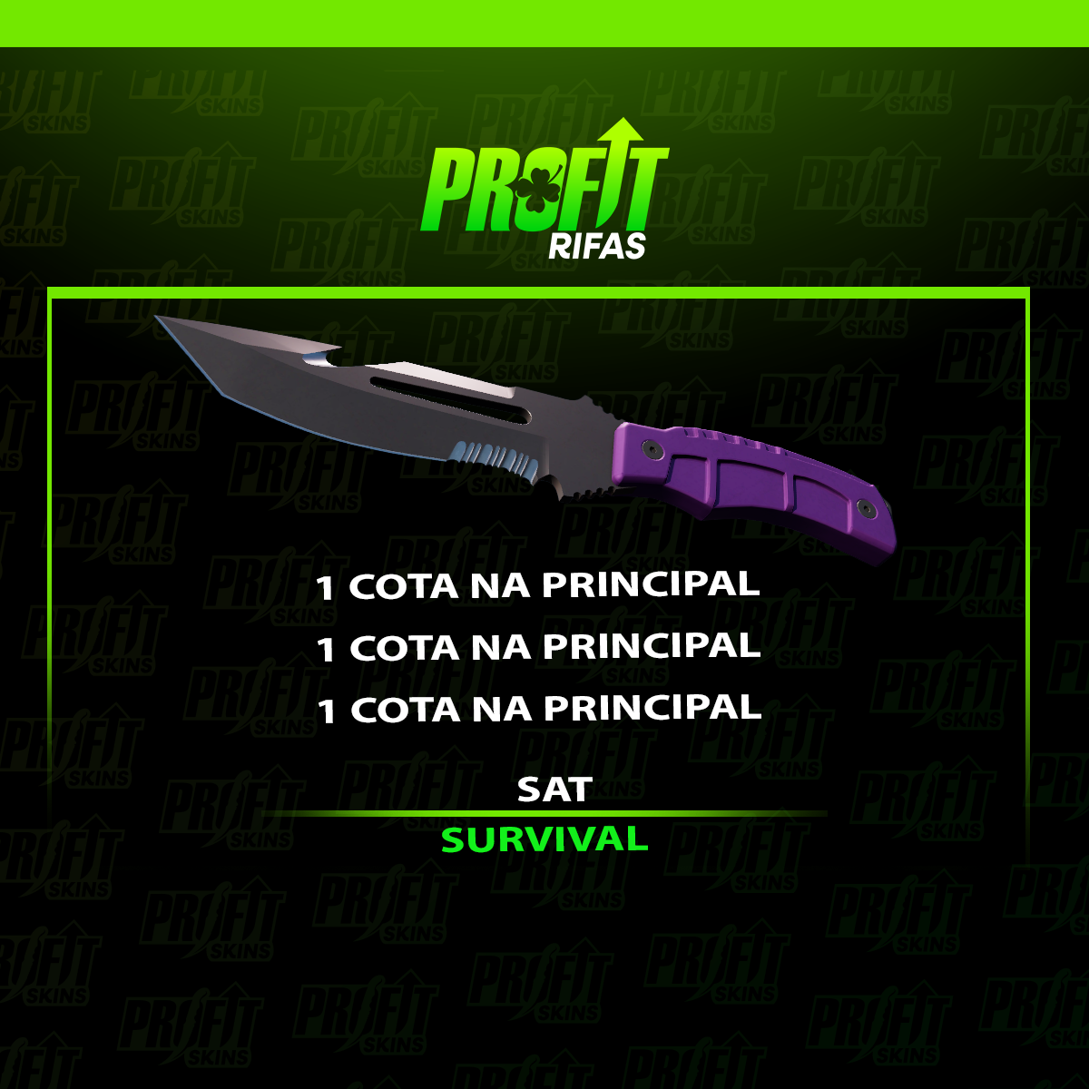 🥇Survival Knife | Ultraviolet (Field-Tested)Valor: R$ 540,00 💰 A cada R$ 30,00 gastos no site de RIFAS, você ganha 1 número na roleta do SORTEIO MENSAL!